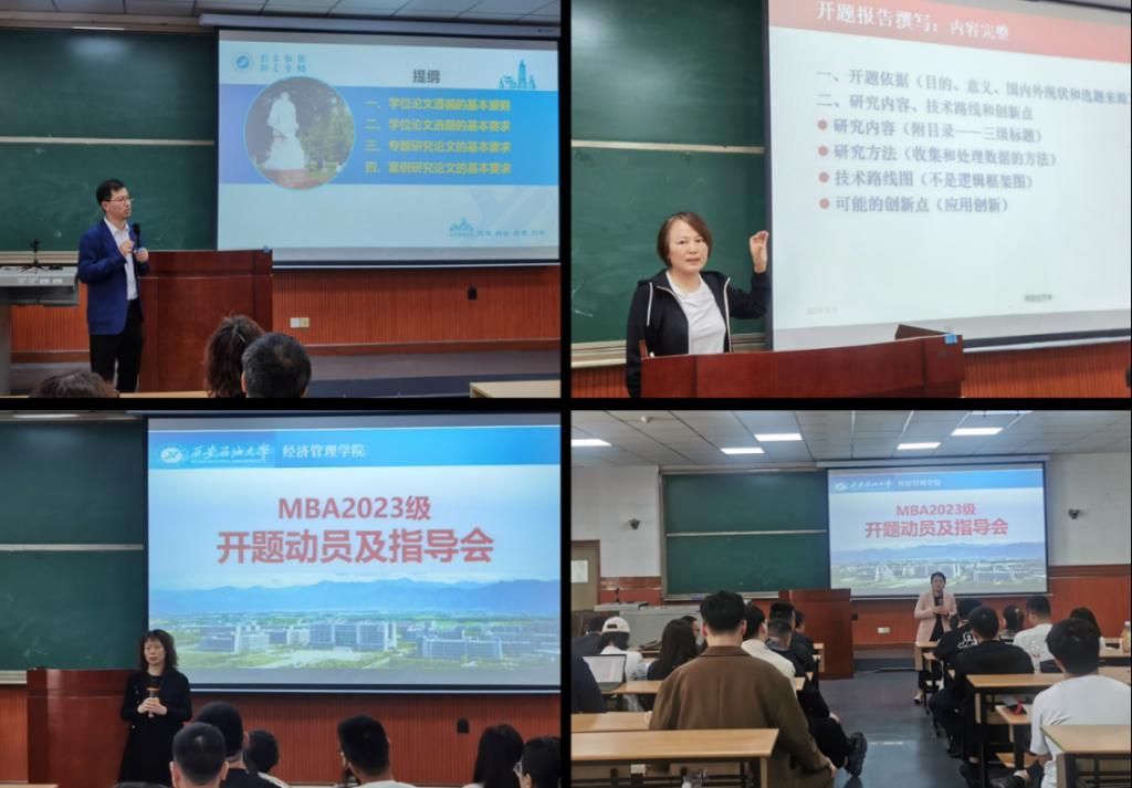 为提升工商管理硕士(MBA)学位论文质量,帮助2023级MBA同学解决论文开题过程中的疑难问题,我校MBA教育中心于5月1日上午在雁塔校区东阶202教室举行了学位论文开题动员和指导活动。经济管理学院院长王君萍教授、副院长李春霄副教授、MBA导师吴文洁教授、MBA教育中心负责人黄莉副教授对2023级MBA同学进行了现场指导。