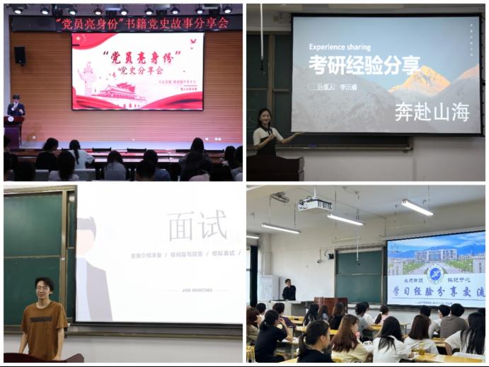 注重示范引领,强化经验分享“优氛围”。学院深入开展培塑先进典型和经验分享活动,建立健全朋辈帮扶制度,引导学生自我管理、自我服务、自我教育、自我监督,形成比、学、赶、帮、超良好氛围。5月6日至15日,学院举办学习经验分享交流会,范瑞宝、徐顾铭等学生代表就学习计划、课堂笔记、复习巩固、资源利用等方面进行了经验分享。10日至18日,各学生党支部开展党员亮身份系列活动,组织“聆听历史,传承荣光”党史故事和红色书籍阅读分享会,学生党支部周昱竹、钱静宜、王安玉、辛芸菲等同学开展多场分享活动,激发了广大学生爱党爱国、向上向善的奋进力量,开展党员“朋辈帮扶,团结互助”活动,积极帮助身边同学学习,主动宣传优秀共产党员的模范事迹。30日,举办毕业季“优秀学子”报告会,学院“就业先锋”金丽红、邵金龙等6位同学就自我认知、简历设计、投递技巧、面试心得等方面分享了求职就业经验。朱琪、王泽基等4位升学同学从不同角度分享了国内外升学的要点与诀窍,对资料的准备和方法以及对如何择校进行了具体介绍,帮助低年级同学对升学和考研有了更深入的了解。