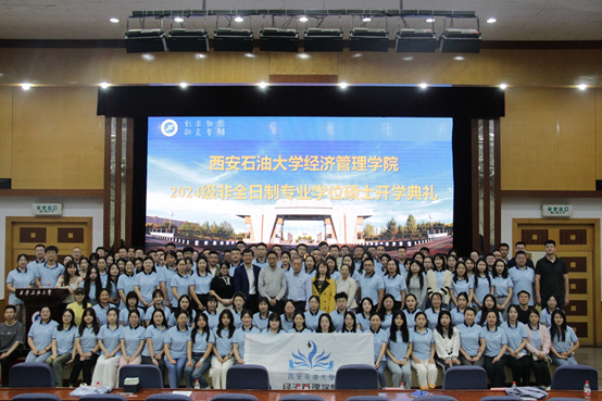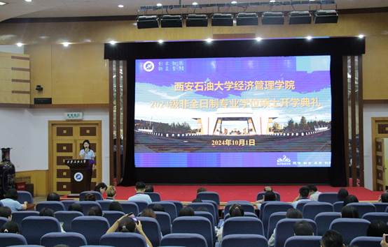 在新中国75周年华诞之际,西安石油大学经济管理学院于10月1日下午在雁塔校区西阶学术报告厅隆重举行了2024级非全日制专业学位硕士研究生开学典礼。学院党委书记谈建勤、院长王君萍、党委副书记杨生强、副院长李春霄、MBA项目负责人黄莉、MPAcc项目负责人宁宇新及学院相关老师出席典礼,典礼由科研与研究生办公室主任武欢主持。来自全国各地的新生齐聚一堂,共同开启了他们崭新的学术旅程。