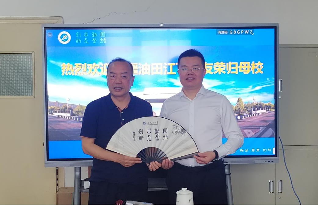 谈建勤书记做了总结发言,他期望江飞校友和其他校友一道加强与母校、学院的联系交流,积极促成与母校各项合作业务开展,不断拓宽合作领域,共同为油田及母校事业发展做出应有的贡献。谈建勤还向江飞校友赠送了纪念品。
