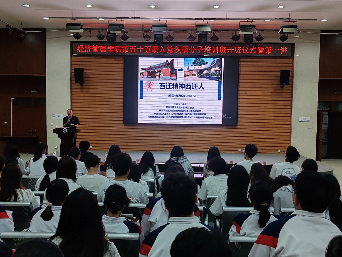 典礼结束后由经济管理学院院长吴勋讲述党课第一讲:《弘扬西迁精神,勇挑时代重任》。吴勋教授从一封由十五位西迁老教授写给习近平总书记的信讲起,通过四部分内容为入党积极分子介绍了西迁精神。第一部分“西迁精神”的核心是爱国主义,让同学们重温“胸怀大局,无私奉献,弘扬传统,艰苦创业”的“西迁精神”,勉励入党积极分子不忘初心、牢记使命。第二部分讲述西迁故事,60多年前,一大批交大人“踏歌向西”,交大人始终秉承“立德树人”的教学理念,让“西迁精神”一代代传承下去。他鼓励入党积极分子们学习其在艰难困苦中迎难而上、艰苦创业、敢于担当作为的精神。第三部分是厚植家国情怀,老一辈们无私奉献,心系家国人民,他们放弃原本优渥的工作和生活条件、放下家人亲友,毅然决然地选择西迁,而西迁背后的这些故事跨越时空,至今依然让人热血沸腾,激励着当代青年奋斗前行,在新时代建功立业。第四部分是致敬西迁教授,从黄浦江畔到渭水之滨,数十年的筚路蓝缕、几代人的薪火相传,西迁教授们为大西北贡献了一所著名学府,圆满完成了当年党和人民交给的重要使命。吴勋教授强调,作为入党积极分子要学习胸怀大局,无私奉献,弘扬传统,艰苦创业的西迁精神,将西迁精神内化于心,外化于行,落实到日常生活中去。