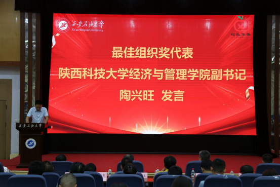 陕西科技大学经济管理学院党委副书记陶兴旺作为最佳组织奖代表发言。他介绍了学校通过顶层设计、导师指导、经费支持等措施保障师生参赛的情况,提议依托赛事平台构建人才培养长效机制,持续提升学生社会认知、专业技能和团队协作意识。