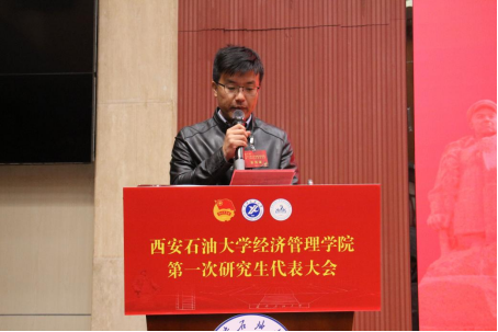 校研究生会执行主席张振陆致辞,他代表校研究生会向大会隆重召开表示最热烈的祝贺,向肩负全院研究生重托的各位代表致以崇高敬意,向学院全体研究生同学致以最诚挚的问候。他表示,经济管理学院是学校“石油底色” 与 “商科特色” 深度融合的重要阵地,近年来学院在学科建设与学生培养上成果丰硕,学子们在各类高水平赛事和社会实践中均展现出过硬专业素养与责任担当。他赞许研究生会成立是学院办学理念的生动实践,搭建了服务师生成长的重要平台,希望第一届研究生会立足学院特色,打造 “懂经管、善服务、肯担当” 的干部队伍,坚守 “服务同学” 初心,以思想引领凝聚同学、聚焦核心需求彰显特色,成为有温度、有力量的集体。同时,他期盼学院研究生会与校研究生会在学术联动、资源共享、干部培训等方面携手共进,为学校学生组织高质量发展添砖加瓦。