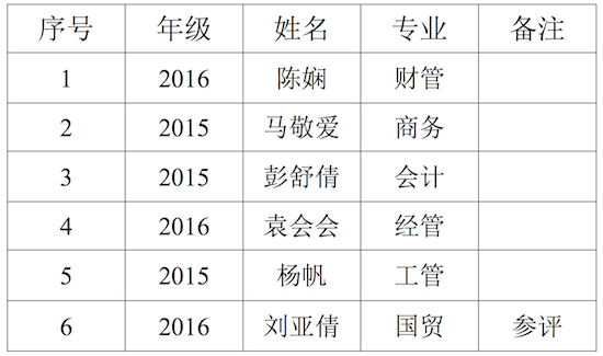 根据学校《关于做好2017-2018学年国家奖学金评审工作的通知》文件精神,经个人申报、经济管理学院国家奖学金评审小组评定,经济管理学院2017-2018学年本科生国家奖学金评选结果如下,现将名单予以公示。